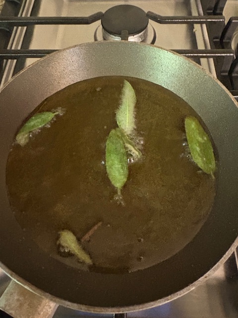- In a separate small skillet, heat the olive oil. When hot, add remaining sage leaves to fry until crisp. Remove to a paper towel-lined plate. Add a spoonful or two of that fragrant sage oil into the butter pan.