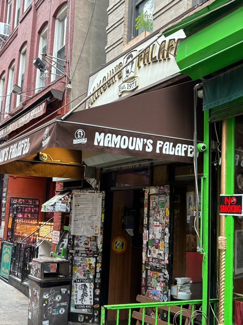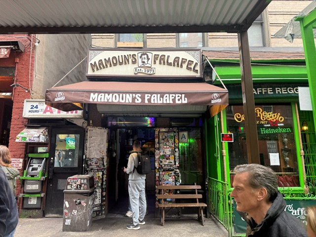 Our small group of adventurers—Maria, me, our friends Warren & Ivana and Erica & John—met up with our guide Lauren, who might just be one of the most fun, knowledgeable guides we’ve ever had. First stop? Mamoun’s Falafel, an NYC staple since 1971. But this wasn’t your average chickpea falafel—these were fava bean falafel, Syrian-style. Crispy on the outside, soft on the inside, and packed with flavor. It was the perfect street food to kick off our walk through MacDougal Street, which, back in the day, was the beating heart of the Beatnik scene. Dylan. Ginsberg. Kerouac. All here. And now us.