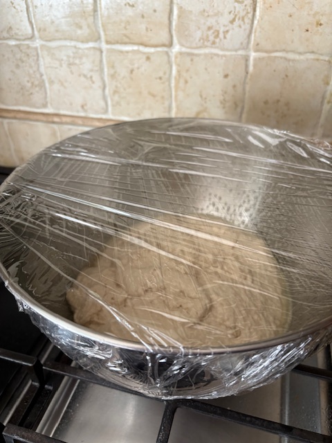 - Pour 4 Tbsp olive oil into a large bowl and transfer the dough into it. Turn the dough in the oil to coat. Cover with plastic wrap or a kitchen towel and let rise until doubled: