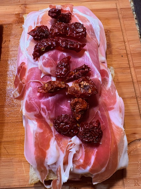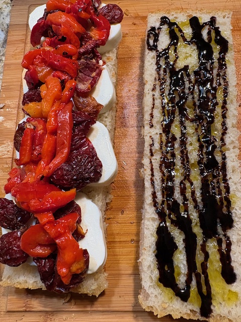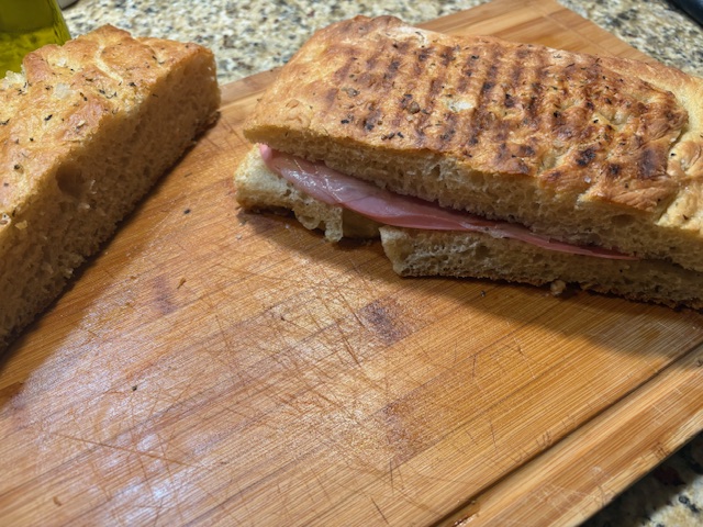 Essentially: you’ve got a venerable bread tradition plus a pressed, creative sandwich culture. And here we are—baking focaccia at home, then filling it with Italian meats, cheeses, roasted veggies, fig jam, balsamic glaze—what a combo.