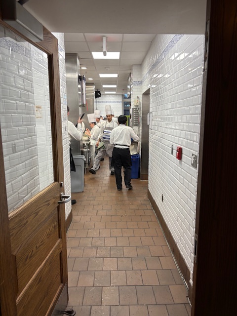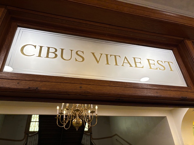 We started with a quick stop in the campus bookstore (so yes, I came home with swag), then joined the tour of the main campus — which is housed in the old Jesuit novitiate St. Andrew-on-Hudson (built in 1903). The chapel, now the stunning dining hall for students, was still in full use. We peeked into kitchens-turned-classrooms, watched students prepping for a reception there that evening — and I’ll admit it: I was a kid in a candy store.