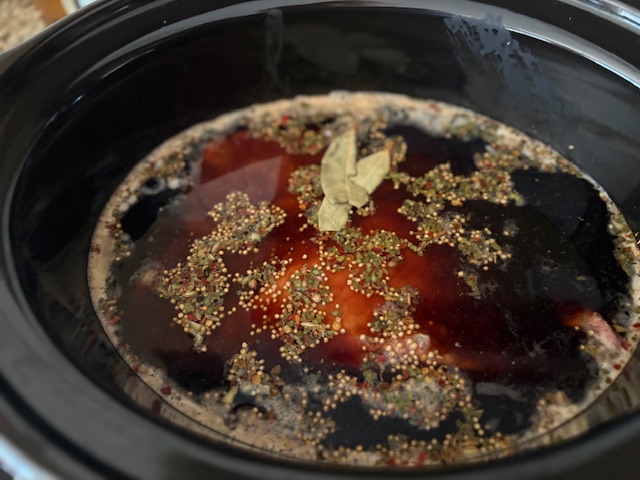 Place everything into a slow cooker, making sure the brisket is fully submerged.
