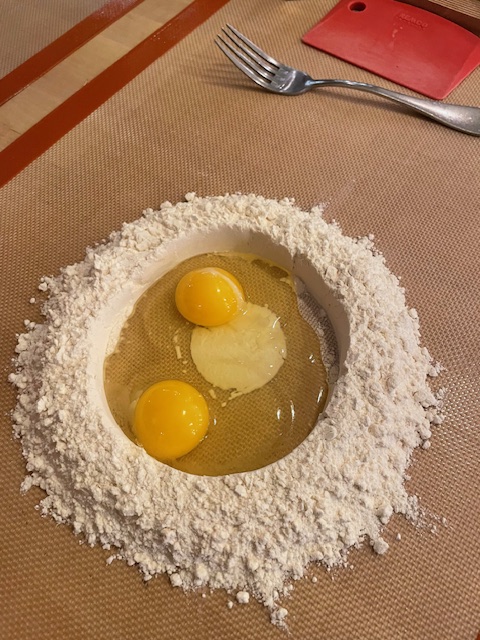 - 1. Mound the flour on a clean surface and make a well in the center. Add eggs and salt.